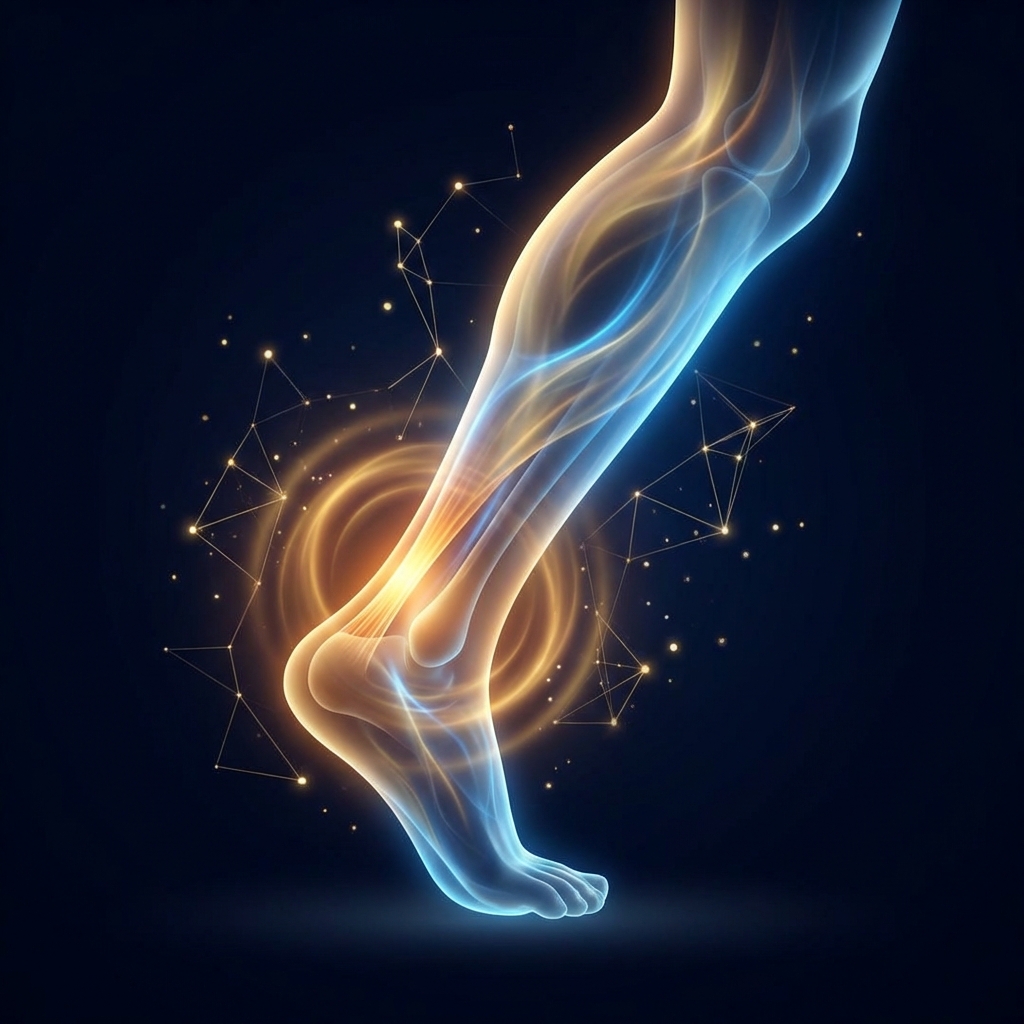 Stylized illustration of Achilles tendon area glowing with regenerative light, representing PRP treatment for Achilles tendonitis