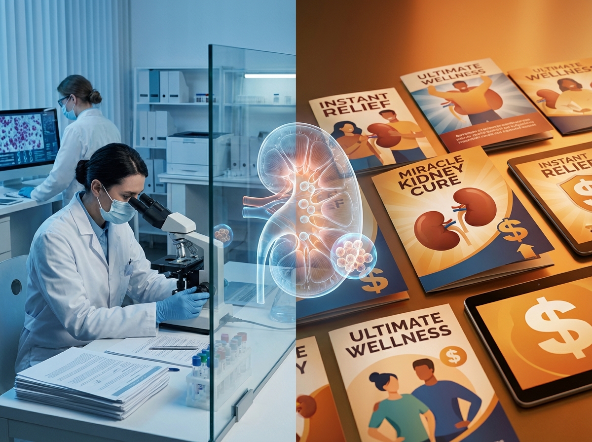 Split view contrasting clinical kidney failure stem cell therapy research with aggressive marketing claims